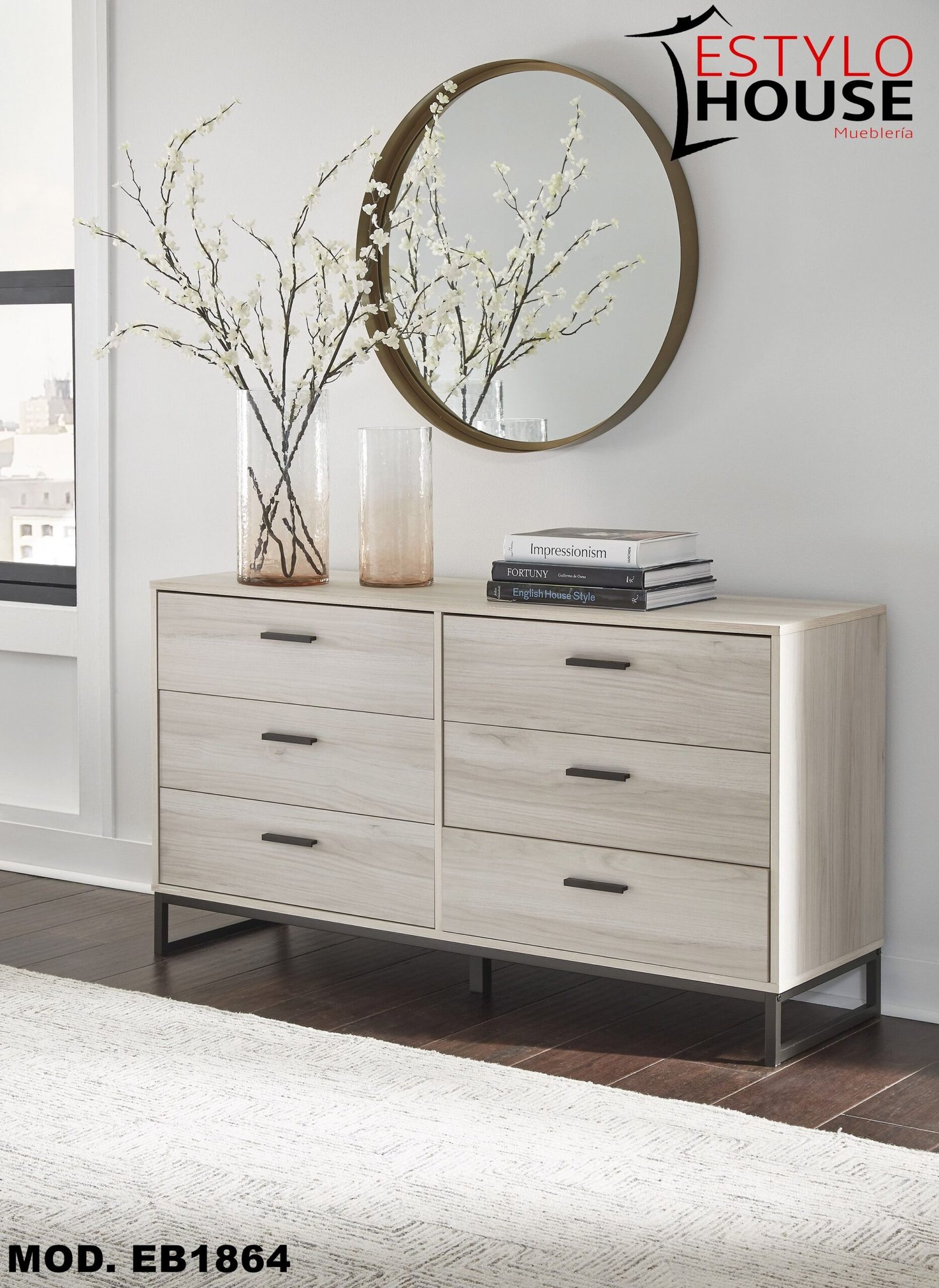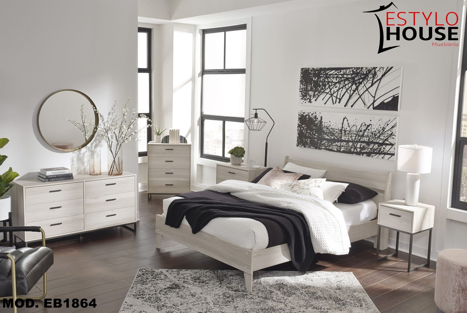 Incluye cama de plataforma tamaño queen (cabecero, pie de cama, rieles y plataforma), cómoda, mesita de noche y tocador de 6 cajones