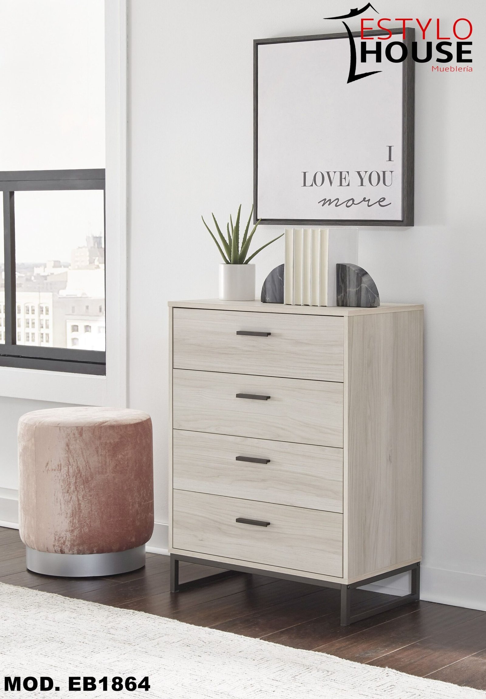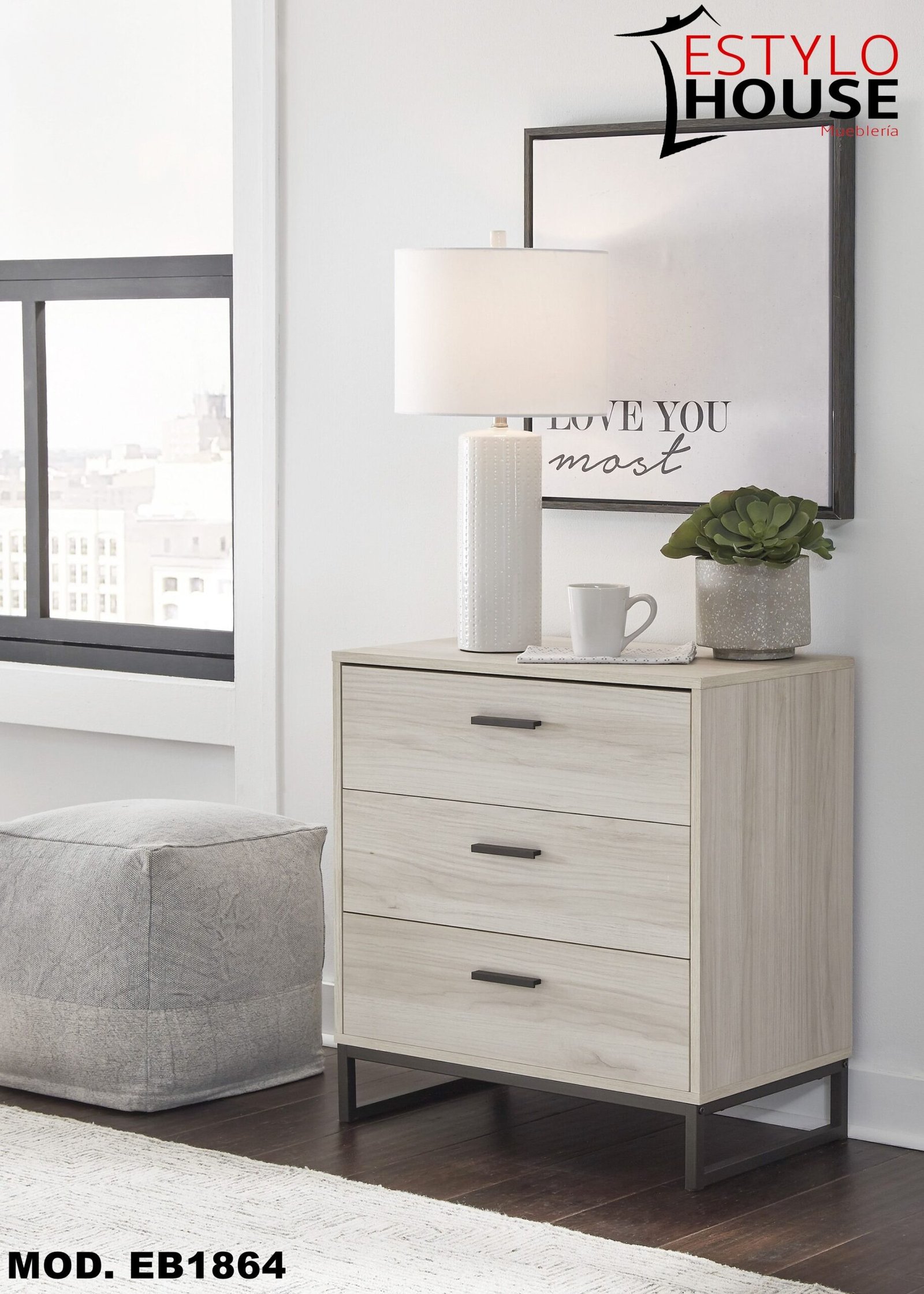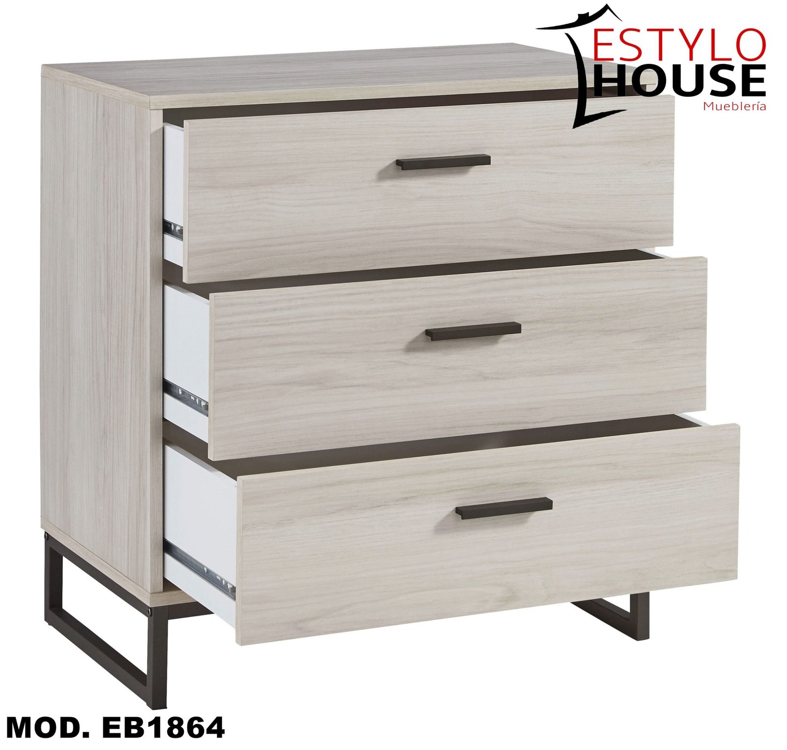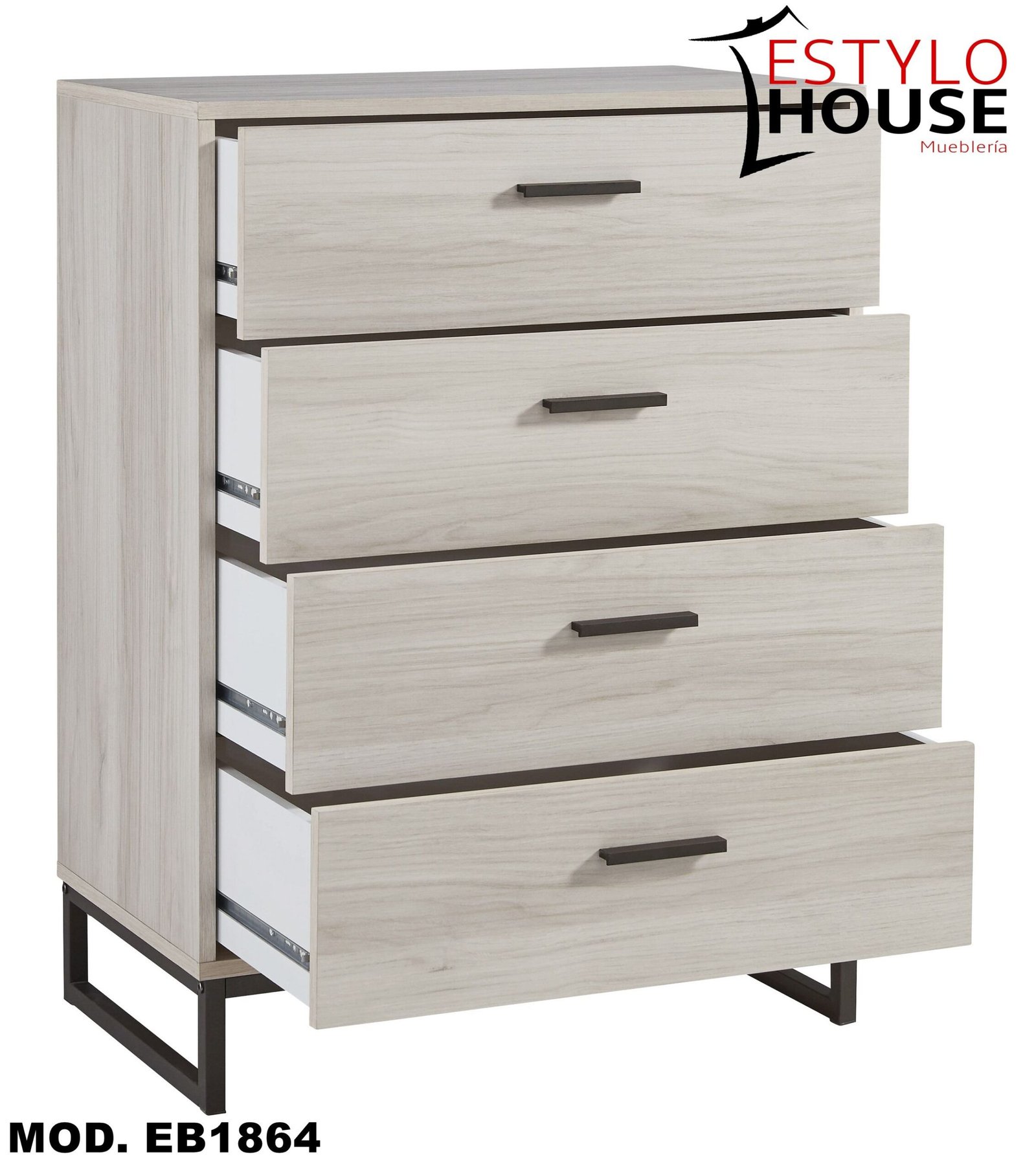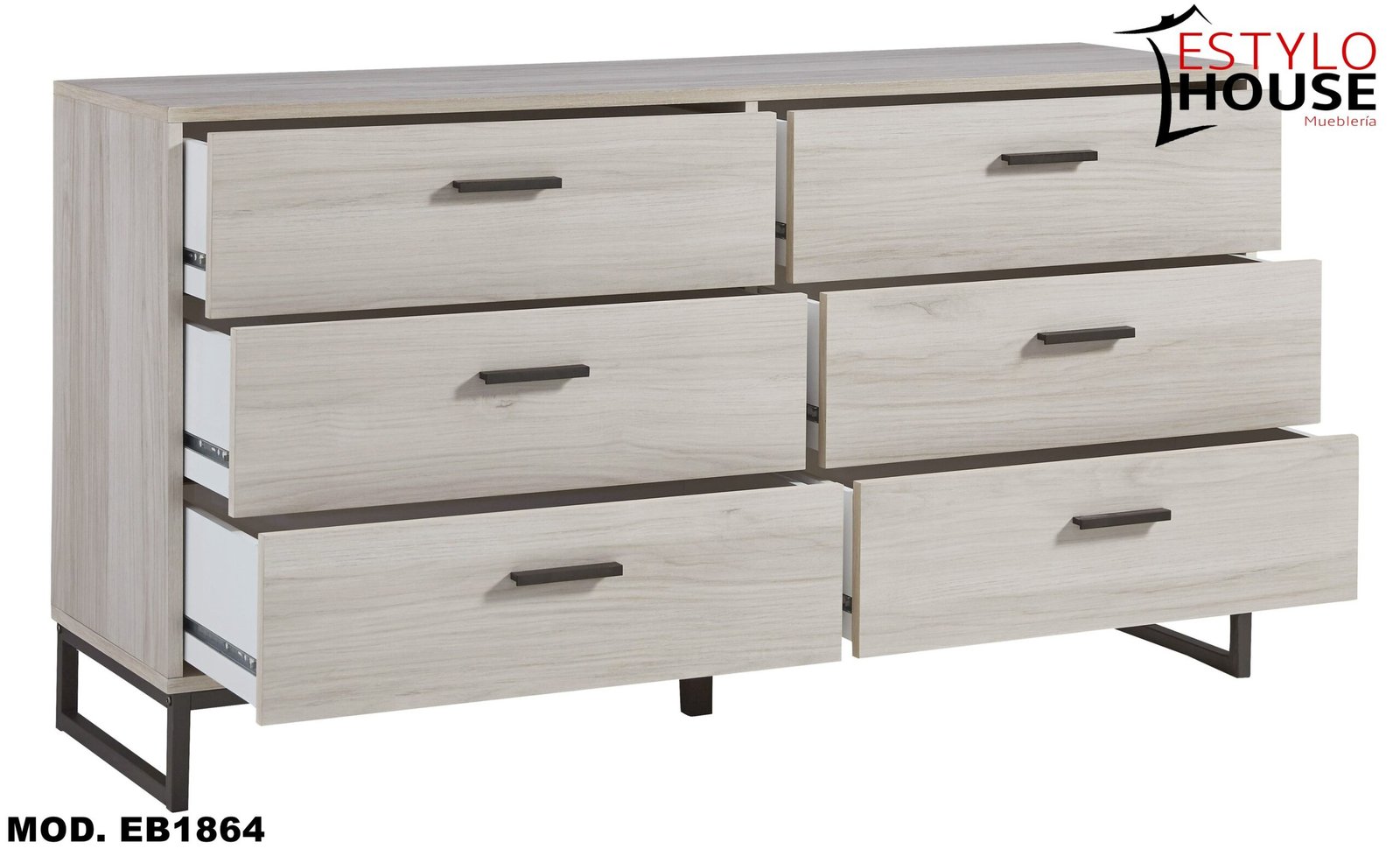 Laterales y respaldo de los cajones revestidos en vinilo para mayor durabilidad; tiradores de tono peltre oscuro